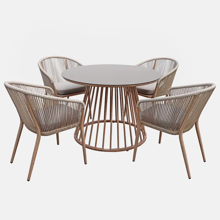 Enhance your dining experience with the Messina 4-Seat Dining Set, a harmonious blend of modern aesthetics and timeless elegance. Crafted with a sturdy aluminium frame featuring a stunning wood-effect finish, this set is enhanced by the luxurious feel of wicker rope. The durable ceramic glass tabletop adds a sophisticated touch, ensuring both beauty and functionality. With weatherproof cushions that promise comfort, this dining set is perfect for enjoying leisurely meals with family and friends.